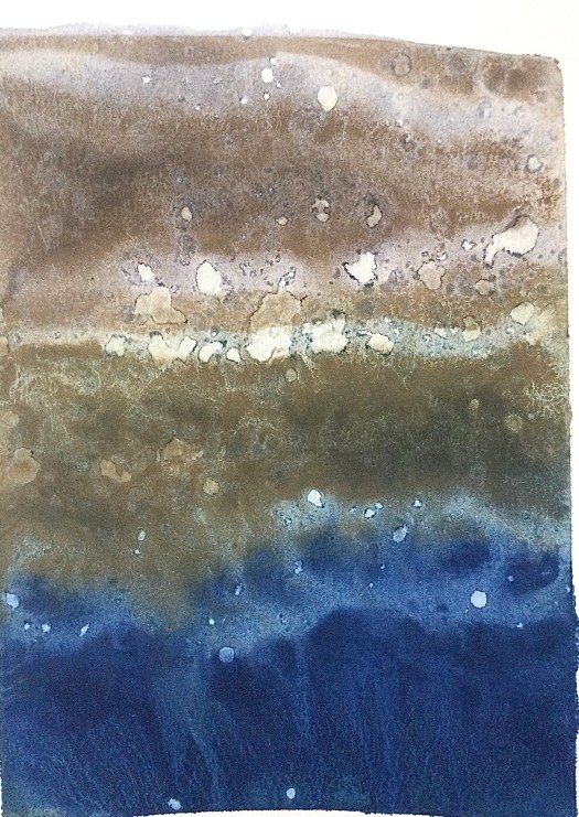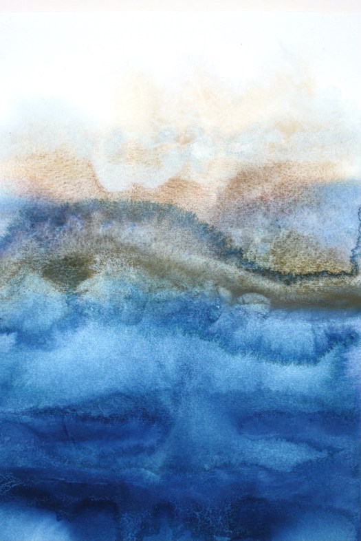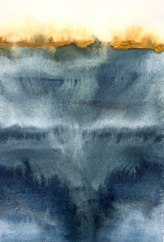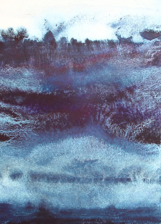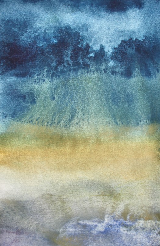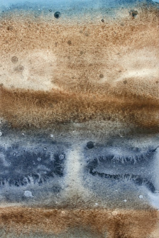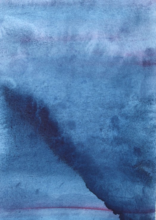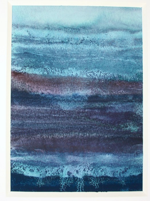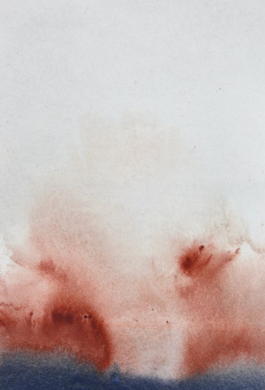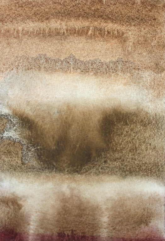 These works appear to form themselves, arriving from nothing, they are the most intuitive, gestural and physical aspect of my creativity. They arrive with a spontaneity of colour stains – throughout the process of creating them, the commitment and work practice were more based on an ancient labour, conducted in almost monastical silence – a concentrated reflection on the fluidity of options and moments – in counterpoint to the written works from The Land Incanted, in which the processual velocity is evident, the physical dedication to the material is made manifest in gestural images that are alive and substantial, guided by turbulent storms over the oceans, by disquiet geologies, by the false maps of hidden lands, by the unnamed winds.